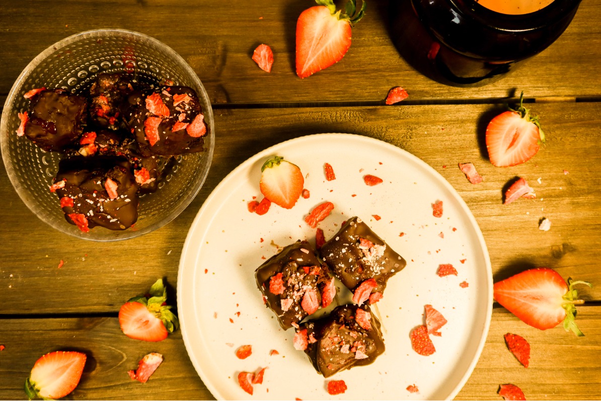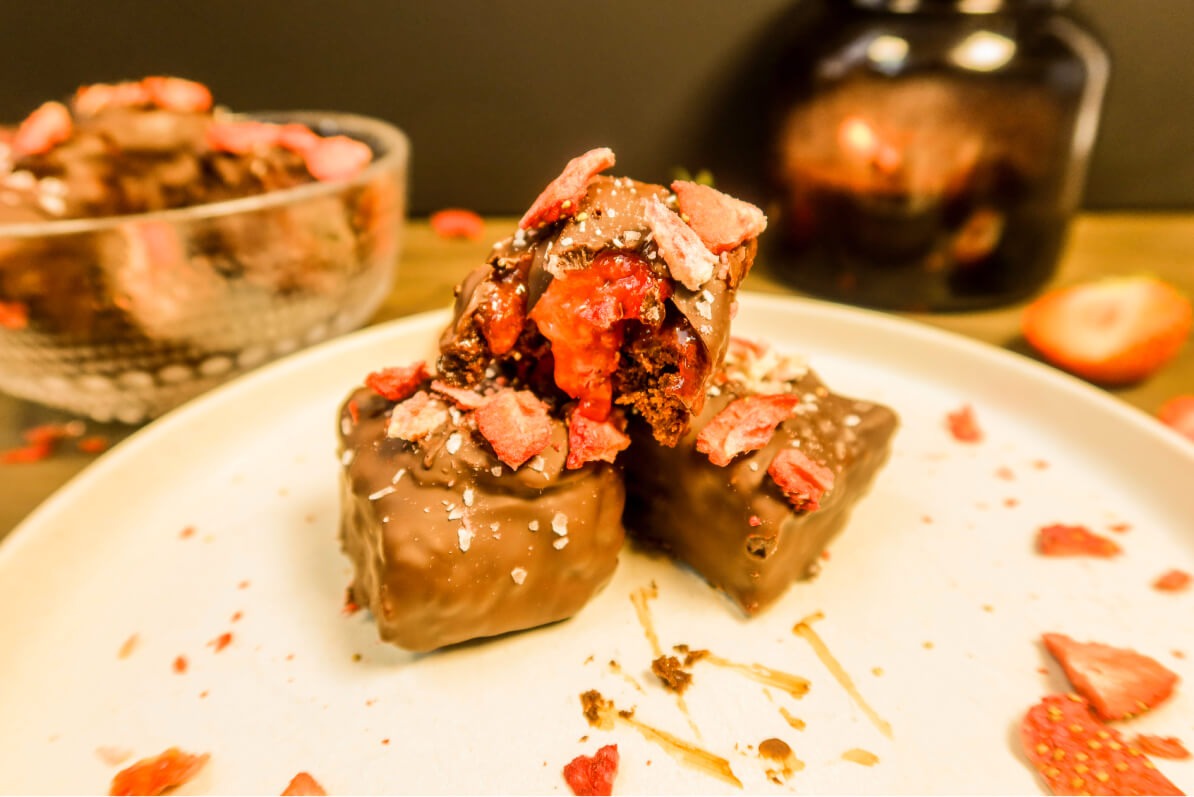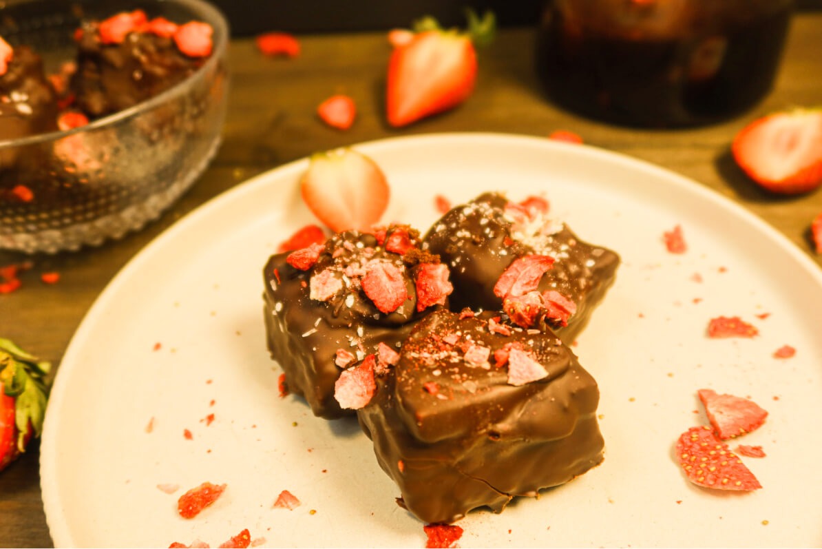 Chocolate Shell – The brownie bites are dipped into a luxurious semi-sweet chocolate coating, then sprinkled with freeze-dried strawberry dust and a pinch of flaky sea salt. The shell adds a decadent crunch and a burst of strawberry flavor to every bite.