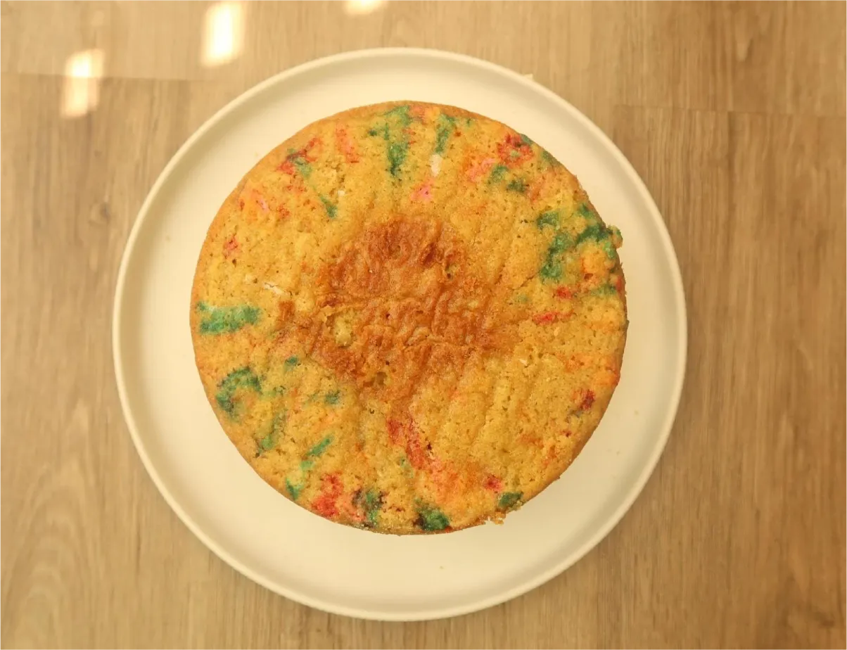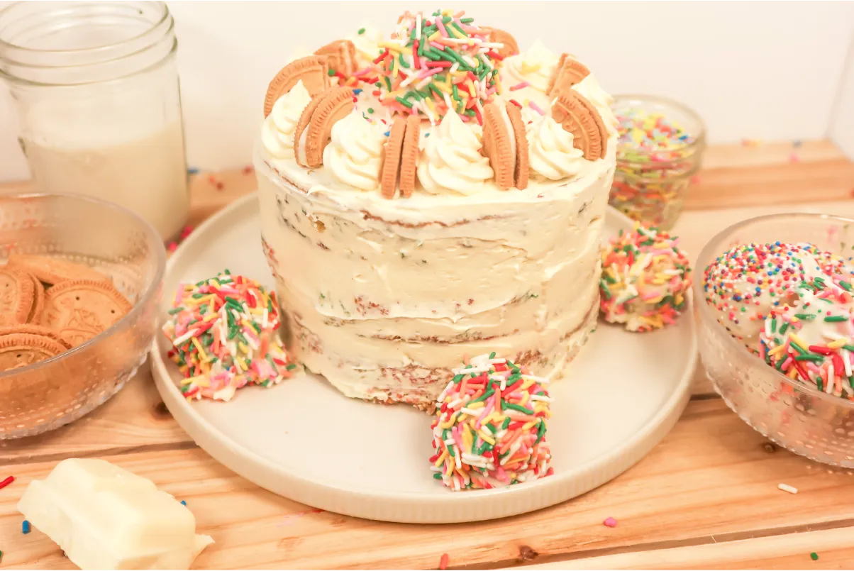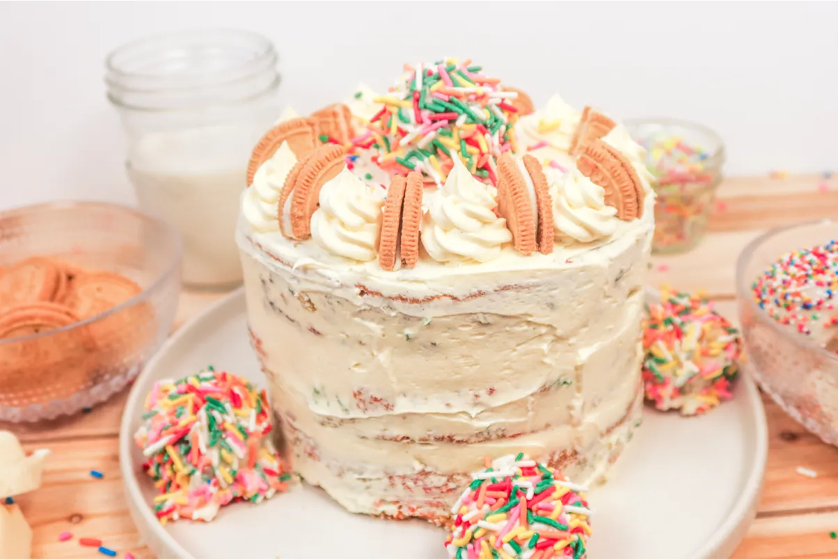 Jimmie Sprinkles & GF Cookie Crumbles – The heart of any Funfetti cake! Jimmie sprinkles melt into the cake for that classic rainbow look, while crushed gluten-free cookies add a surprising crunch.