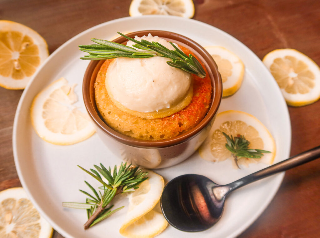 - Add the candied lemon to the top and a spring of rosemary for decoration.